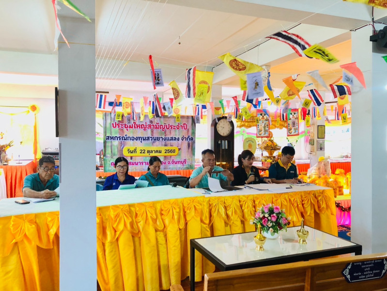 วันพุธ ที่ 22 ตุลาคม 2568 เวลา 09.00 น. นางสาวหทัยชนก พุทธาโร ผู้อำนวยการกลุ่มส่งเสริมสหกรณ์ 1 พร้อมด้วยนางสาวโยธกา ไชยเพชร นักวิชาการสหกรณ์ปฏิบัติการ สำนักงานสหกรณ์จังหวัดจันทบุรี เข้าร่วมประชุมใหญ่สามัญประจำปี 2568 ปีบัญชีสิ้นสุด 30 มิถุนายน 2568 ของสหกรณ์กองทุนสวนยางแสลง จำกัด ณ วัดโสมนาราม ตำบลแสลง อำเภอเมืองจันทบุรี จังหวัดจันทบุรี