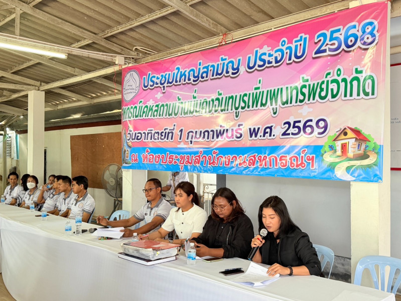 วันอาทิตย์ที่ 1 กุมภาพันธ์ 2569 เวลา 09.00 น. นางสาวหทัยชนก พุทธาโร นักวิชาการสหกรณ์ชำนาญการ พร้อมด้วยข้าราชการ สำนักงานสหกรณ์จังหวัดจันทบุรี เข้าร่วมประชุมใหญ่สามัญประจำปี 2568 สหกรณ์เคหสถานบ้านมั่นคงจันทบูรเพิ่มพูนทรัพย์ จำกัด ณ สำนักงานสหกรณ์เคหสถานบ้านมั่นคงจันทบูรเพิ่มพูนทรัพย์ จำกัด