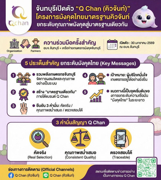 วันศุกร์ที่ 6 กุมภาพันธ์ 2569 เวลา 09.30 น. นายสุภาพ เกิดบุญ สหกรณ์จังหวัดจันทบุรี พร้อมด้วยบุคลากร สำนักงานสหกรณ์จังหวัดจันทบุรี ร่วมประชุมหารือกับผู้แทนภาคเกษตรกร เครือข่ายวิสาหกิจชุมชนแปลงใหญ่มังคุด รับฟังรายละเอียด “Q Chan (คิวจันท์)” โครงการมังคุดไทยมาตรฐานเดียว ยกระดับคุณภาพ สร้างความเชื่อมั่นทางการตลาดอย่างยั่งยืน รับฟังปัญหาและข้อกังวลของผู้ประกอบการมังคุด ร่วมกันหาแนวทางแก้ไข และให้คำแนะนำในการขับเคลื่อนโครงการคิวจันท์ เพื่อเตรียมความพร้อมขับเคลื่อนโครงการ มุ่งจัดการผลผลิตและคุณภาพมังคุดอย่างเป็นระบบ ตั้งแต่ต้นทางถึงปลายทาง ณ ห้องประชุมสำนักงานสหกรณ์จังหวัดจันทบุรี