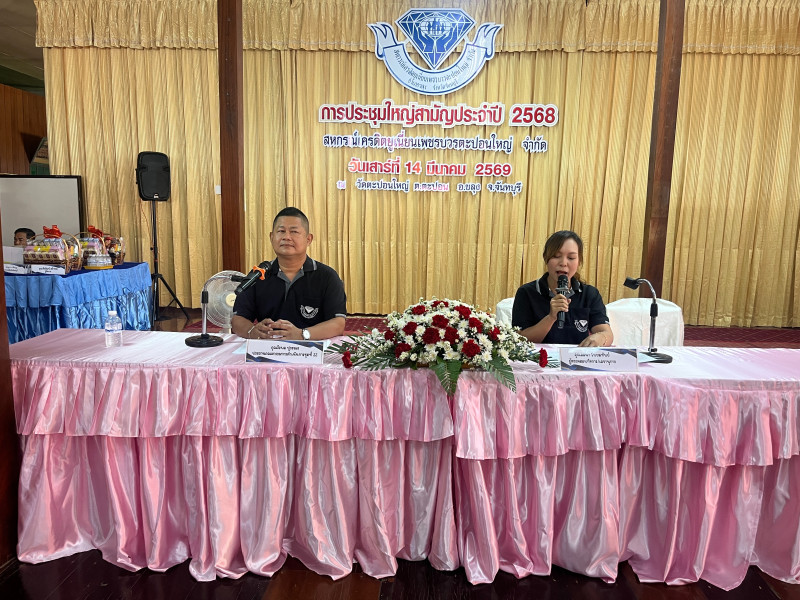 วันเสาร์ที่ 14 มีนาคม 2569 สำนักงานสหกรณ์จังหวัดจันทบุรี โดยนายสุภาพ เกิดบุญ สหกรณ์จังหวัดจันทบุรี และนายสรวิศิษฎ์ สุวรรณจักร์ ผู้อำนวยการกลุ่มส่งเสริมสหกรณ์ 3 พร้อมด้วยพนักงานราชการกลุ่มส่งเสริมสหกรณ์ 3 ร่วมประชุมใหญ่สามัญประจำปี 2568 สหกรณ์เครดิตยูเนี่ยนเพชรบวรตะปอนใหญ่ จำกัด ณ ศาลาวัดตะปอนใหญ่ ตำบลตะปอน อำเภอขลุง จังหวัดจันทบุรี